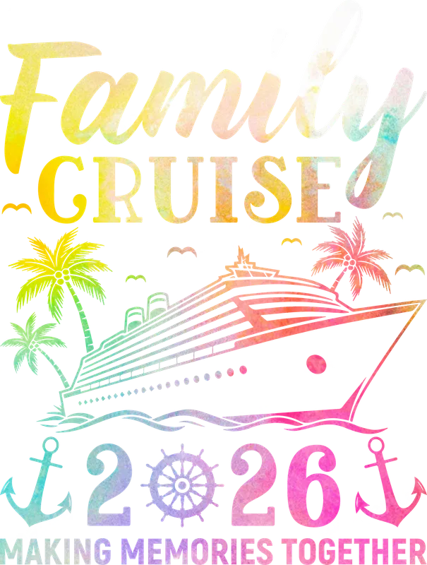 See allSet sail on your next adventure with our vibrant 'Family Cruise 2026 Making Memories Together' DTF transfer. This captivating heat transfer features a classic cruise ship, tropical palm trees, and playful birds, all rendered in a beautiful watercolor ombre style. The year '2026' is charmingly integrated with an anchor and ship's wheel, perfect for creating matching apparel for your upcoming family vacation. This unique shirt design is ideal for families planning a memorable cruise vacation in 2026. Unite your group with coordinated outfits, whether heading to the Caribbean, Alaska, or a European river cruise. It makes a fantastic gift for cruise enthusiasts, grandparents, and kids alike. Create custom t-shirts, tote bags, or swim cover-ups using this easy iron on decal to commemorate your special trip and look festive. Our direct to film transfer is incredibly easy to apply, requiring no weeding. Simply place your apparel transfer onto your chosen garment. For best results, use a heat press at 300-325°F for 15 seconds with medium pressure, then peel cold. You can also achieve great results with a household iron on cotton, polyester, and most fabric blends. Detailed instructions are included, making customization quick and hassle-free. Experience professional-grade results with our premium DTF transfer. Each design boasts incredibly vibrant, crack-resistant colors that stand out beautifully on any fabric, ensuring your custom transfer pops. The advanced film technology makes these transfers exceptionally durable, designed to withstand numerous washes without fading. Enjoy a soft, smooth feel that integrates seamlessly with the garment, providing comfort and a high-quality finish for all your family cruise wear.