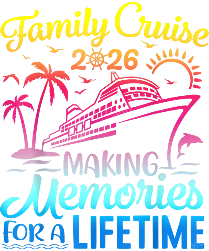 See allEmbark on a journey of a lifetime with our "Family Cruise 2026 Making Memories" DTF transfer. This vibrant design captures the essence of a tropical vacation, featuring a majestic cruise ship, swaying palm trees, a setting sun, playful dolphins, and soaring birds. The colorful gradients evoke a joyous, relaxed atmosphere, perfect for commemorating your special family adventure. This high-quality DTF transfer is ready to press, ensuring smooth application for custom apparel projects. This unique heat press transfer is ideal for families planning their 2026 cruise vacation, family reunions, or any group travel event. Create matching shirts, hoodies, or beach bags for everyone, making it easy to spot your crew and capture memorable photos. It's also a thoughtful gift for cruise enthusiasts or a surprise trip reveal. Celebrate togetherness and the excitement of new experiences with this charming design. Applying this apparel transfer is a breeze with a professional heat press or household iron. For best results, use a a heat press at 300-325°F for 15 seconds with medium pressure. This ready to press design requires no weeding or intricate layering, saving time and effort. Simply press onto cotton, polyester, or blend fabrics for a professional finish. Detailed instructions are provided for a perfect application every time. Our DTF transfers are renowned for exceptional quality, offering incredibly vibrant colors that pop and a soft, smooth feel. The durable film ensures your design is crack-resistant and stands up to countless washes, allowing you to cherish your "Making Memories for a Lifetime" slogan for years. This professional iron on transfer is engineered to deliver stunning results and lasting wear on all your custom creations.