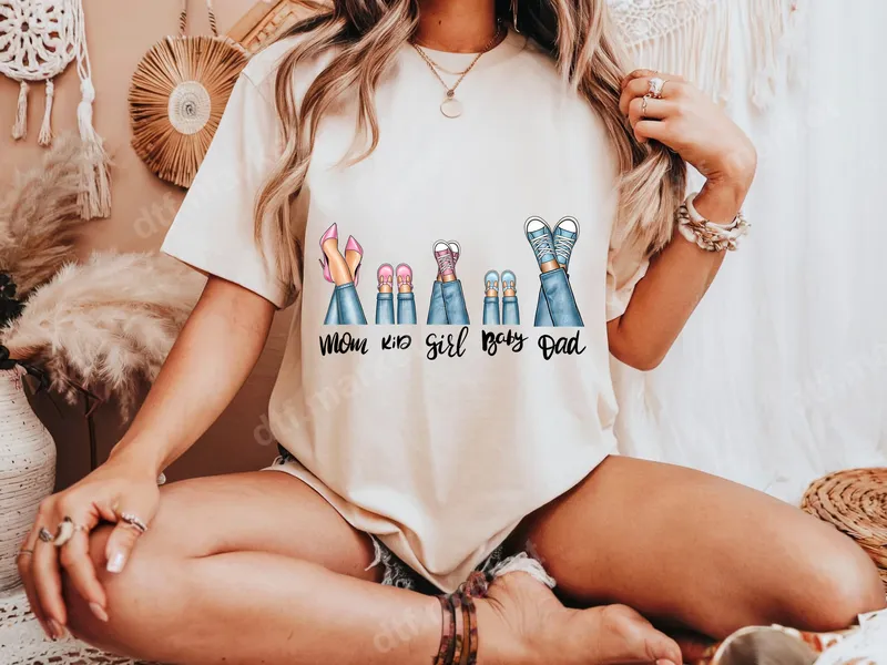See allThis charming family feet DTF transfer captures the fun and love of family life with its whimsical illustration of Mom, Dad, and Kids' shoes. Featuring cute hand-drawn style, this direct to film transfer is perfect for personalizing apparel. It's a ready to press transfer that brings a heartwarming touch to any garment, showcasing a playful lineup of family footwear. Ideal for moms, dads, and grandparents, this heat press transfer is a wonderful way to celebrate family bonds. It makes a thoughtful gift for Mother's Day, Father's Day, birthdays, family vacations, or just everyday wear to show off your cherished crew. Perfect for matching family outfits or unique personalized gifts. Applying this vibrant heat press design is a breeze. Our high-quality iron on transfer works flawlessly on a wide range of fabrics including cotton, polyester, and cotton/poly blends. For best results, use a heat press at 300-325°F for 15 seconds with medium pressure. No weeding required, making your customization project quick and easy. Crafted for durability and exceptional appeal, this t-shirt transfer delivers vivid colors that resist cracking and fading, ensuring your design looks great wash after wash. The professional DTF film offers a soft hand feel and strong adhesive properties, providing a premium finish that stands the test of time.