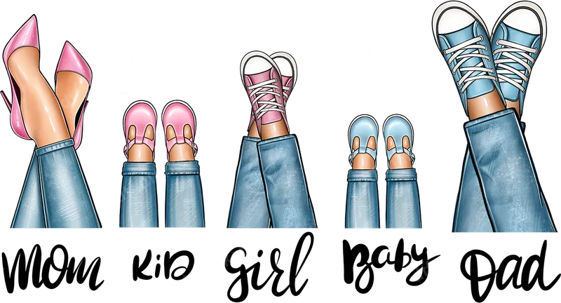 See allThis charming DTF transfer features an adorable illustration of a family's feet, uniquely styled to represent Mom, Dad, a Kid, a Girl, and a Baby. From Mom's chic pink heels to Dad's cool blue sneakers and the kids' sweet footwear, this design beautifully captures the essence of family togetherness. It’s a high-quality, ready to press design perfect for adding a personal touch to any garment. This versatile heat transfer is ideal for celebrating family bonds on many occasions. Perfect for new parents, grandparents, or anyone creating matching family apparel. Use it for Mother's Day, Father's Day, baby showers, gender reveals, family vacations, or as a thoughtful holiday gift. This design makes an excellent choice for personalized items that will be cherished for years. Our direct to film heat transfer ensures easy application on cotton, polyester, and blends. This heat press ready transfer offers professional results. Simply apply with a heat press at 300-325°F for 15 seconds with medium pressure, or carefully with a household iron. Best of all, no weeding required, saving time on your custom transfer projects. Enjoy superior quality with this premium apparel transfer. Printed with vibrant, long-lasting colors, the design resists cracking, peeling, and fading, ensuring durability. It results in a soft-to-touch finish that integrates seamlessly with the fabric. Crafted using professional-grade DTF film, this iron on decal guarantees a flawless and professional look.