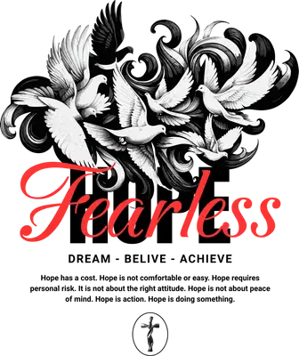 This striking DTF transfer features a dynamic flock of white doves soaring amidst dramatic black and grey abstract swirls, embodying freedom and grace. The bold red script "Fearless" overlaying "HOPE" creates a powerful message of resilience and optimism. Below, the words "DREAM - BELIVE - ACHIEVE" further emphasize an empowering journey, making this a truly inspirational ready to press design. A detailed paragraph on hope as action and a subtle cross motif anchor the design in faith and purpose. This impactful design is perfect for individuals seeking daily inspiration or looking to express their Christian faith through their apparel. It's an ideal iron on transfer for church groups, youth ministries, or as thoughtful gifts for Confirmation, Baptism, or spiritual milestones. Small t-shirt businesses and Etsy sellers specializing in faith-based merchandise will find this heat transfer design an excellent addition to their product line, offering customers a unique way to wear their convictions. Applying this premium heat press transfer is incredibly straightforward, working seamlessly on a wide range of fabrics including cotton, polyester, and cotton-poly blends, and even nylon. Achieve professional results with a heat press set at 300-325°F for 15 seconds with medium pressure, or easily apply with a household iron. Forget tedious weeding; this direct to film transfer is peel-and-press ready. It's perfect for custom t-shirts, hoodies, sweatshirts, tote bags, pillow covers, and even denim jackets, allowing for versatile garment customization. For best longevity, wash garments inside out and tumble dry low. Experience exceptional quality with every ready to press transfer. This design boasts vibrant, full-color printing with intricate details that bring the doves and typography to life. Our DTF transfers are crack-resistant, soft to the touch, and avoid the heavy, stiff feel often associated with traditional vinyl transfers. Each direct to film transfer is meticulously printed on premium DTF film with a robust adhesive backing, ensuring professional, durable results that stand the test of time on any garment.