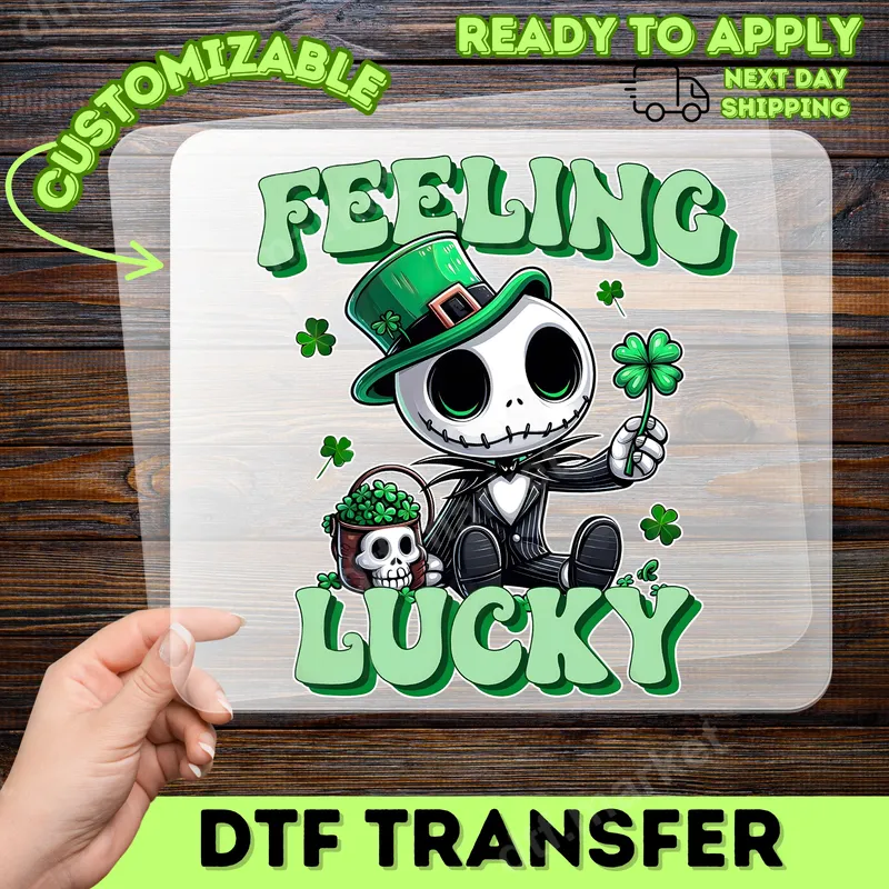 See allThis vibrant DTF transfer features a charming, skeleton character resembling Jack Skellington, festively adorned in a green top hat and holding a lucky four-leaf clover. Bold green lettering proudly declares "FEELING LUCKY" in a playful, bubbly font, surrounded by scattered shamrocks. This ready to press design perfectly blends spooky cute aesthetics with classic St. Patrick's Day cheer, making it an eye-catching heat transfer for any celebration. This unique heat press design is ideal for fans of spooky cute aesthetics, Nightmare Before Christmas enthusiasts, and anyone looking to add a touch of playful luck to their wardrobe. Perfect for St. Patrick's Day parties, parades, or just showing off your festive spirit, it makes a fantastic gift for friends, family, or even yourself. Create custom t-shirts, sweatshirts, or tote bags for a memorable holiday look. Our high-quality direct to film transfers are designed for easy application on a wide range of fabrics, including cotton, polyester, and various blends. For best results, use a heat press at 300-325°F for 15 seconds with medium pressure, followed by a cold peel. A household iron can also be used with care. Enjoy professional results with no weeding required, making your custom projects simple and fun. Each iron on transfer boasts incredibly vibrant colors and sharp details, ensuring your apparel design stands out. Crafted from premium DTF film, these durable transfers are crack-resistant, wash-fast, and provide a soft-to-touch finish that feels like part of the fabric. Experience professional-grade quality with strong adhesion, guaranteeing your lucky design lasts wear after wear.