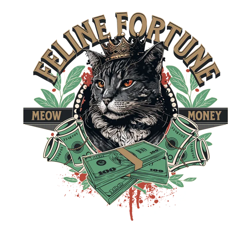 See allThis eye-catching DTF transfer features a regal black cat, adorned with a golden crown, exuding an aura of wealth and power. Flanked by stacks of crisp hundred-dollar bills and bold "FELINE FORTUNE" and "MEOW MONEY" typography, this design perfectly blends feline charm with a hustler's ambition. The vibrant colors and intricate details make it a standout piece, delivered as a ready to press design that's perfect for making a statement. Ideal for cat enthusiasts, streetwear fashion lovers, entrepreneurs, and anyone with a "get that money" mindset. This unique heat press transfer is fantastic for personalizing your wardrobe, creating custom gifts, or adding an edgy touch to merchandise. It’s perfect for casual wear, themed parties, or as a fun iron on decal for friends who appreciate luxury and a bit of playful sass. Our direct to film transfers are incredibly versatile and can be applied to a wide range of fabrics, including cotton, polyester, and various blends. For best results, use a heat press at 300-325°F for 15 seconds with medium pressure, then cold peel. For household iron users, press firmly and evenly. Say goodbye to tedious weeding; these ready to press transfers are designed for easy application, ensuring a smooth and professional finish every time. Crafted with premium professional DTF film, this high-quality shirt design offers exceptional durability and a vibrant, crisp image. The strong adhesive ensures your design stays put, resisting cracks and peels even after multiple washes. Enjoy a soft, flexible feel that seamlessly integrates with your garment. Elevate your apparel with a heat press design that looks fantastic and lasts.
