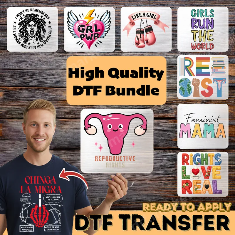 See allThis powerful DTF transfer bundle features a collection of designs celebrating feminism, empowerment, and social justice. From the bold "GRL PWR" and Medusa's defiant stance to statements like "Reproductive Rights" and "RESIST," each ready to press transfer is designed to help you wear your values proudly. This diverse set also includes impactful designs like "Chinga La Migra" and "Feminist MAMA," offering a range of styles to make a statement. This apparel transfer collection is perfect for activists, feminists, women's rights advocates, and anyone who stands for social justice. Use these designs to create custom gear for protest rallies, community events, women's marches, or as unique gifts for like-minded friends and family. They're ideal for expressing solidarity, promoting awareness, and sparking important conversations wherever you go. Applying your new heat press designs is simple and hassle-free. Our high-quality DTF transfers are compatible with a wide range of fabrics, including cotton, polyester, and various blends, ensuring versatility for all your projects. For best results, use a heat press at 300-325°F for 15 seconds with medium pressure. These iron on transfers require no weeding or pre-treatment, making customization quick and easy for beginners and pros alike. Experience professional-grade results with every direct to film transfer. Our premium DTF film delivers vibrant colors, sharp details, and excellent wash durability, ensuring your designs remain crack-resistant and soft to the touch even after multiple washes. The strong adhesive backing ensures a lasting bond with your chosen garment, making your custom apparel stand out for its quality and message.