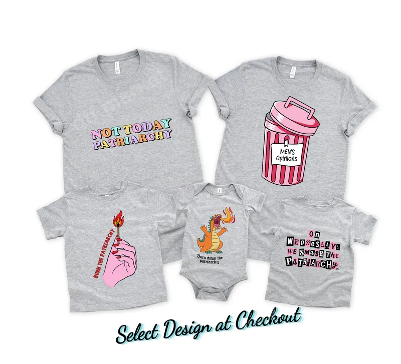 See allThis collection of Direct-to-Film (DTF) transfers embodies powerful feminist statements, perfect for those ready to challenge the status quo. Each ready to press transfer offers a unique visual, from the colorful retro "NOT TODAY PATRIARCHY" to a sassy pink trash can for "MEN'S OPINIONS," and playful yet fierce designs like a dragon proclaiming "Burn down the Patriarchy" or a hand holding a flaming match. The collection also includes an edgy "ON WEDNESDAYS WE SMASH THE PATRIARCHY" design, drawing on popular culture. These unique heat press transfers are designed for activists, feminists, and anyone who wants to wear their convictions with pride. They make empowering gifts for friends, sisters, or mothers on International Women's Day, protests, rallies, or simply for daily wear to spark conversation. Perfect for expressing solidarity, these designs empower wearers to make a clear, bold statement against outdated systems, celebrating strength and collective action. Applying your new shirt design is incredibly easy. Our high-quality DTF transfers are compatible with a wide range of fabrics, including cotton, polyester, and their blends, ensuring versatility for your projects. For best results, use a heat press at 300-325°F for 15 seconds with medium pressure. These iron on transfers can also be applied with a household iron, making customization accessible for everyone. Best of all, there's no weeding or layering required, simplifying your crafting process. Experience superior quality with our professional-grade apparel transfers. Each direct to film transfer is produced using vibrant, eco-friendly inks that ensure your design remains vivid and crack-resistant wash after wash. The durable DTF film and strong adhesive provide a soft, smooth feel on any garment, making it comfortable to wear. You’ll receive a premium heat transfer that looks professionally printed and stands the test of time, reflecting your powerful message with clarity and style.