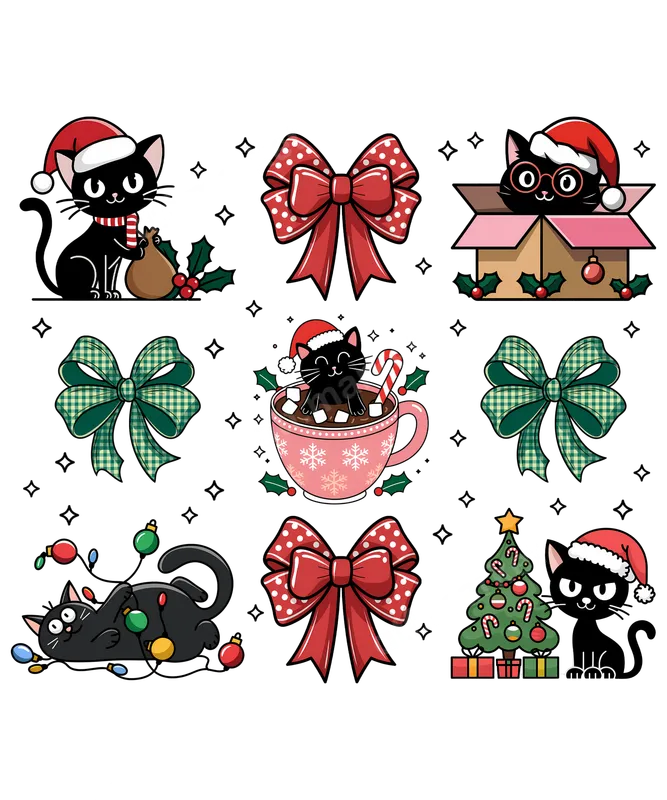 See allThis delightful collection features nine charming black cat designs, each playfully capturing the spirit of Christmas. From a cat nestled in a hot cocoa mug to one tangled in festive lights, and others adorned with Santa hats or peeking from gift boxes, these designs bring whimsical holiday joy. Accented with classic red and green bows, this DTF transfer pack is ready to press, offering an instant touch of festive cheer to any garment. Perfect for devoted cat parents, anyone who loves cute animals, or those looking to add a unique twist to their holiday wardrobe. These versatile designs are ideal for Christmas parties, family gatherings, gift exchanges, or simply cozying up at home during the festive season. They also make fantastic personalized gifts for friends and family, allowing you to create custom apparel that truly stands out. Applying these high-quality heat transfers is incredibly simple. Our ready to press transfers work seamlessly on a wide range of materials, including cotton, polyester, and various fabric blends. For best results, use a heat press at 300-325°F for 15 seconds with medium pressure. These iron on decals also achieve great results with a household iron, making personalization accessible to everyone. Forget tedious weeding; just press and peel! Experience professional-grade results with every application. Our DTF transfers boast vibrant colors that pop, superior crack resistance for long-lasting wear, and a soft-to-touch finish that feels great against the skin. Crafted from premium DTF film with a strong adhesive, these apparel transfers ensure your designs stay put and look fantastic wash after wash, maintaining their original charm.