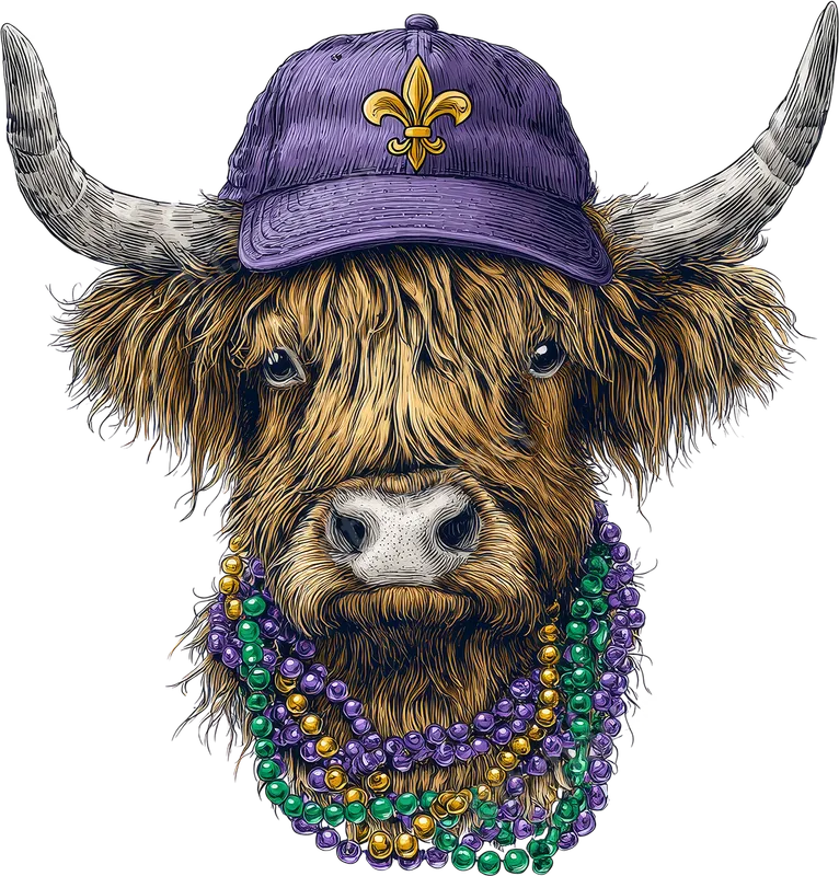 Festive Highland Cow Mardi Gras DTF Transfer with Beads & Fleur-de-lis