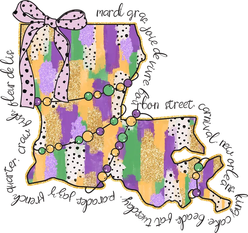 Festive Mardi Gras Louisiana Map DTF Transfer with Beads