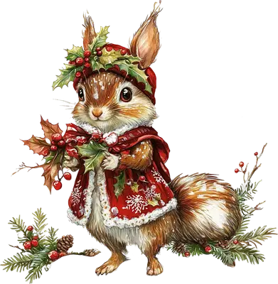 Festive Watercolor Christmas Squirrel Holly Berries DTF Transfer