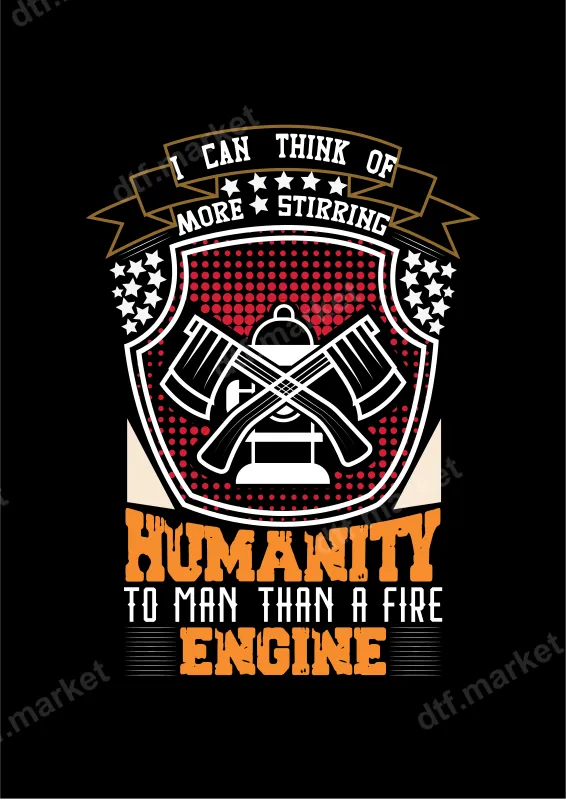 See allThis vibrant DTF transfer features a striking shield design, proudly showcasing crossed firefighter axes and a classic fire hydrant. Emblazoned with the inspiring quote, "I CAN THINK OF MORE STIRRING HUMANITY TO MAN THAN A FIRE ENGINE," this ready to press design captures the essence of courage and dedication. The bold typography and patriotic stars add a powerful touch, making it an ideal statement piece for anyone who supports our everyday heroes. This heroic design is perfect for current firefighters, retired veterans, fire academy recruits, and their supportive families, including fire wives and children. It makes an excellent gift for birthdays, Father's Day, graduations, or any occasion to show appreciation for first responders. Customize apparel for local fire department events, community fundraisers, or simply to express your pride in their selfless service. Our high-quality heat press transfer is incredibly versatile, applying beautifully to a wide range of fabrics including 100% cotton, polyester, and blends. For best results, apply with a heat press at 300-325°F for 15 seconds with medium pressure. This iron on transfer ensures a flawless finish without weeding or complex layering, saving you time. Experience professional-grade results with our durable heat press design. Each DTF transfer is produced using premium inks and film, guaranteeing vibrant colors that pop and a soft, smooth feel on your garment. It's designed to be crack-resistant and withstand countless washes, ensuring your apparel transfer maintains its stunning look for years to come.