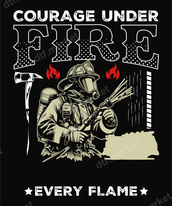 See allThe design depicts a heroic firefighter in full gear, wielding a hose, with an axe visible. Bold text reads "COURAGE UNDER FIRE" and "EVERY FLAME." It's a tribute to the bravery and dedication of fire rescue professionals. This high-quality DTF transfer captures the intense spirit of those who face danger daily, making it a powerful statement piece for any apparel. It's a ready to press design, meaning you can easily apply it to your favorite items. This impactful heat press design is perfect for active firefighters, retired veterans of the fire service, fire academy graduates, and their proud families. It’s an ideal gift for birthdays, Father's Day, Christmas, or any occasion to show appreciation for their service. Wear it to support local fire departments, at community events, or simply as an everyday display of respect for these heroes. It’s also a great way for supporters to express solidarity with their local fire station. Our versatile direct to film transfers adhere beautifully to a wide range of fabrics including cotton, polyester, and various blends. Applying this iron on decal is simple: use a heat press at 300-325°F for 15 seconds with medium pressure, then perform a cool peel. For smaller projects or home use, a household iron can also be used following careful instructions. Unlike traditional vinyl transfer designs, there's no tedious weeding required, saving you time and effort. Expect outstanding quality with this t-shirt transfer. Our DTF prints boast vibrant colors that pop, are incredibly durable, and crack-resistant, ensuring your design looks great wash after wash. The professional DTF film provides a soft, flexible feel that seamlessly integrates with the garment, making it comfortable to wear. With a strong, reliable adhesive, your apparel transfer will stay put, showcasing your admiration for firefighters with lasting impact.
