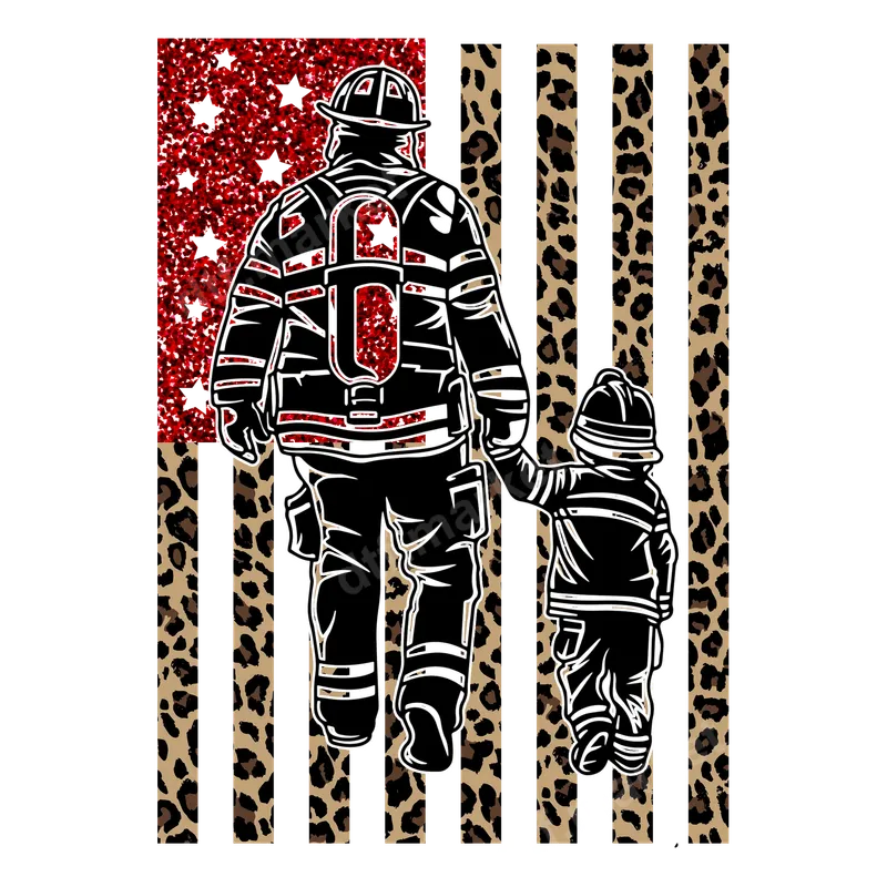 Firefighter Dad & Child Leopard Flag Glitter DTF Transfer Ready To Press