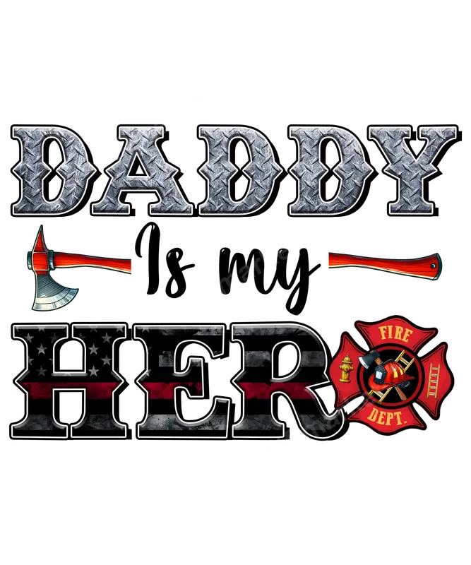 See allThis striking DTF transfer proudly declares "DADDY Is my HERO" in a bold, heartfelt design. "DADDY" features a rugged metallic diamond plate texture, while "HERO" incorporates a powerful distressed American flag graphic with the iconic Thin Red Line, symbolizing courage and sacrifice. Stylized firefighter axes flank "Is my," and a classic Maltese cross fire department emblem adds an authentic touch. This ready to press design is perfect for honoring a brave firefighter dad. This apparel transfer is ideal for anyone celebrating their firefighter father, husband, or loved one. It makes a perfect gift for Father's Day, birthdays, Christmas, or any occasion to show immense pride and appreciation for first responders. Children, spouses, and family will love creating custom shirts or accessories. It's also great for firefighter families to wear to community events, parades, or as everyday wear. Applying this heat transfer is simple and accessible. It works beautifully on a wide variety of materials, including 100% cotton, 100% polyester, and all cotton/poly blends. For best results, use a heat press at 300-325°F for 15 seconds with medium pressure, then peel cold. A household iron can also be used with care. No complex weeding or layering is required; just a single, professional iron on decal that applies effortlessly. Crafted using premium DTF film and vibrant, high-quality inks, this direct to film transfer ensures stunning color clarity and exceptional durability. The resulting print is incredibly soft to the touch, flexible, and crack-resistant, designed to withstand numerous washes without fading or peeling. You'll receive a professional-grade heat press ready design that offers superior adhesion and a lasting finish, making your custom apparel truly stand out.