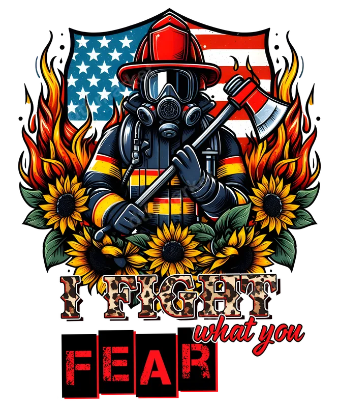 See allThis bold "I Fight What You Fear" DTF transfer showcases a fearless firefighter in full gear, axe in hand, against a striking American flag backdrop. Vibrant flames and beautiful sunflowers frame the design, adding powerful visual elements to this detailed piece. This high-quality direct to film transfer is ready to press, making it easy to create custom apparel with a professional finish. Perfect for honoring the brave firefighters in your life, this design is ideal for active firefighters, their families, and supporters of first responders. It makes a fantastic gift for birthdays, Father's Day, or any occasion to show appreciation. Wear it proudly on Firefighter Appreciation Day, at patriotic events, or as an everyday statement of courage and dedication. Applying this heat press transfer is straightforward for both beginners and pros. Our premium heat press ready design works seamlessly on a wide range of materials, including cotton, polyester, and their blends. For best results, use a heat press at 300-325°F for 15 seconds with medium pressure, then cold peel. No tedious weeding or complex layering required – just press and go! Experience outstanding durability and color vibrancy with this professional iron on transfer. Our DTF transfers are crafted to be crack-resistant, incredibly soft to the touch, and maintain their vivid colors wash after wash. Each apparel transfer is made using high-grade film and strong adhesive, ensuring your custom creations look fantastic and last for years.
