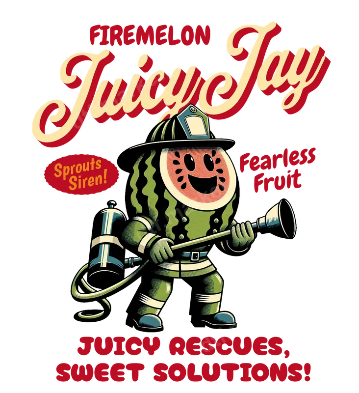 See allIgnite your style with our 'Firemelon Juicy Jay' DTF transfer! This vibrant, retro-style design showcases a smiling watermelon character heroically dressed as a firefighter, complete with helmet, uniform, and a trusty hose. Featuring catchy slogans like 'Sprouts Siren!', 'Fearless Fruit', and 'JUICY RESCUES, SWEET SOLUTIONS!', this graphic blends playful bravery with vintage cartoon charm. It's a premium DTF transfer, perfectly crafted and ready to press for unique apparel. This fun and unique design appeals to firefighters, their proud families, fruit lovers, pun aficionados, and fans of classic cartoon aesthetics. It makes an outstanding gift for birthdays, Father's Day, or as a thoughtful appreciation gesture for those in the fire service. Ideal for casual wear, themed events, or adding heroic humor, Firemelon Juicy Jay brings a sweet solution to any wardrobe. Applying your 'Firemelon Juicy Jay' design is incredibly easy. This high-quality ready to press transfer works seamlessly with a heat press (300-325°F for 15 seconds, medium pressure), adhering perfectly to cotton, polyester, and blends. Forget the hassle of weeding; this iron on transfer requires no intricate cutting like traditional vinyl transfers, making your customization process quick and effortless for a professional finish. Experience superior durability and stunning visual appeal with our professional-grade direct to film transfer. The colors are incredibly vibrant, ensuring your Firemelon Juicy Jay pops off any garment. Designed to be crack-resistant and soft to the touch, this transfer maintains its integrity and comfortable feel even after multiple washes. Trust in a high-quality apparel transfer that delivers lasting, professional results every time.