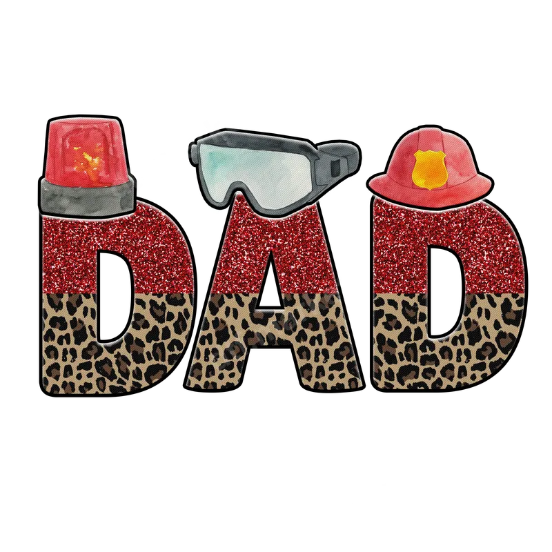 See allCelebrate the everyday heroes with this distinctive 'DAD' DTF transfer. This vibrant design features bold letters with a sparkling red glitter top and a trendy leopard print bottom. Each letter is crowned with elements symbolizing hardworking fathers: a flashing siren, protective goggles, and a classic firefighter helmet. This eye-catching, ready to press design is perfect for customizing apparel that truly stands out. This versatile heat transfer is ideal for fathers who are firefighters, first responders, mechanics, construction workers, or any hands-on tradesman. It makes an exceptional gift for Father's Day, birthdays, or Christmas. Imagine dad proudly wearing this unique design on a custom t-shirt at family gatherings, sporting events, or casual outings. It's a fantastic choice for thoughtful presents from kids and spouses. Applying this professional-grade DTF transfer is incredibly easy, whether using a commercial heat press or a household iron. Our high-quality iron on decal adheres flawlessly to a wide range of materials like cotton, polyester, and blends. Simply press this ready to press transfer at 300-325°F for 15 seconds with medium pressure, then peel cold. No weeding required, making this heat press ready design a hassle-free way to personalize garments quickly. Experience superior quality with our DTF transfers. This premium apparel transfer boasts vibrant colors and sharp details that won't fade or crack. The innovative film ensures a soft, flexible feel on your fabric, making your custom shirt design comfortable. Crafted with strong, long-lasting adhesive, this direct to film transfer guarantees professional results that withstand countless washes and everyday wear for years.