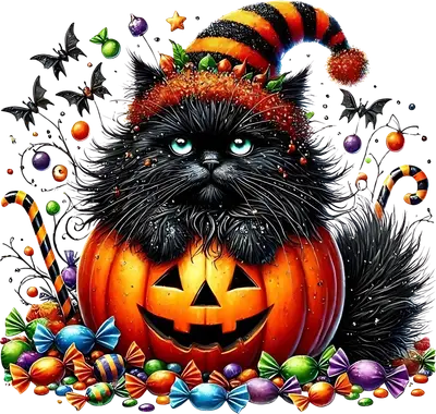 Fluffy Black Cat Witch Hat Jack-O'-Lantern Halloween DTF Transfer