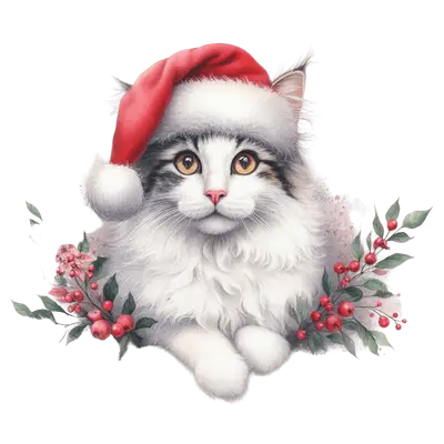 Fluffy Christmas Cat with Santa Hat & Berries DTF Transfer