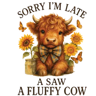 Fluffy Highland Cow 'Sorry I'm Late' DTF Transfer