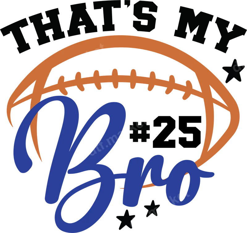 See allThe "That's My Bro #25" DTF transfer is a spirited design for celebrating your favorite football player. It features an orange football outline, bold black text "THAT'S MY", and a dynamic blue script "Bro" with player number "#25". Accentuated by black stars, this ready to press design captures team spirit and sibling pride, making it a vibrant direct to film transfer for personalized apparel. This football-themed heat press design is ideal for sisters, parents, and family members of players, especially those with jersey number 25. Perfect for showing support at games, pep rallies, or team events. Create custom t-shirts, hoodies, or fan gear. This iron on transfer also makes a fantastic gift for birthdays or end-of-season banquets for any proud football family. Our versatile DTF transfers are designed for easy application on cotton, polyester, and various fabric blends. Achieve professional results using a heat press at 300-325°F for 15 seconds with medium pressure, cool peel. For home use, this heat press ready apparel transfer can also be applied with a household iron, ensuring a smooth, durable finish. Enjoy the convenience of a ready to press shirt design with no weeding or layering. Experience superior quality with our premium DTF film transfers. Each transfer boasts vibrant colors and sharp details, engineered to be crack-resistant and highly durable. These designs withstand numerous washes without fading or peeling. The special adhesive ensures a strong bond, resulting in a soft, lightweight feel that moves with the fabric. Elevate your custom apparel projects with a professional-grade vinyl transfer alternative that's built to last.