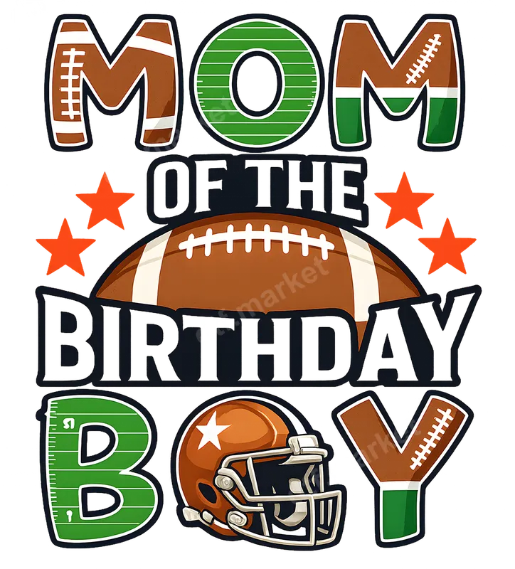 See allThis vibrant "Mom of the Birthday Boy" DTF transfer is the perfect design for any proud football mom. Featuring bold, athletic-themed lettering, the design incorporates classic football elements like field lines, laces, and a helmet, all highlighted with bright orange stars. This ready to press transfer brings a festive, sporty vibe ideal for celebrating your son's special day with football flair. This football-themed heat press design is made for proud mothers celebrating their son's birthday, especially if he's a football player or enthusiast. It's perfect for birthday parties, family gatherings, or even game days leading up to his birthday. It makes an excellent gift for a mom who wants to show her team spirit and celebrate her child simultaneously. Easily create custom apparel for the big event. Our direct to film transfers are incredibly versatile and easy to apply. They work flawlessly on a wide range of fabrics, including 100% cotton, 100% polyester, and various cotton/poly blends. For best results, use a heat press at 300-325°F for 15 seconds with medium pressure. Even if you don't have a professional heat press, this iron on transfer can be applied using a household iron with firm, even pressure. No tedious weeding or layering required! Experience professional quality with every heat transfer. Our DTF transfers boast incredibly vibrant colors that pop, ensuring your design stands out. They are crack-resistant, durable, and maintain a soft, flexible feel on the garment, unlike traditional vinyl transfer. Made with premium DTF film and a strong adhesive, these apparel transfers are designed for longevity and washability, making them a lasting memory of the special day.