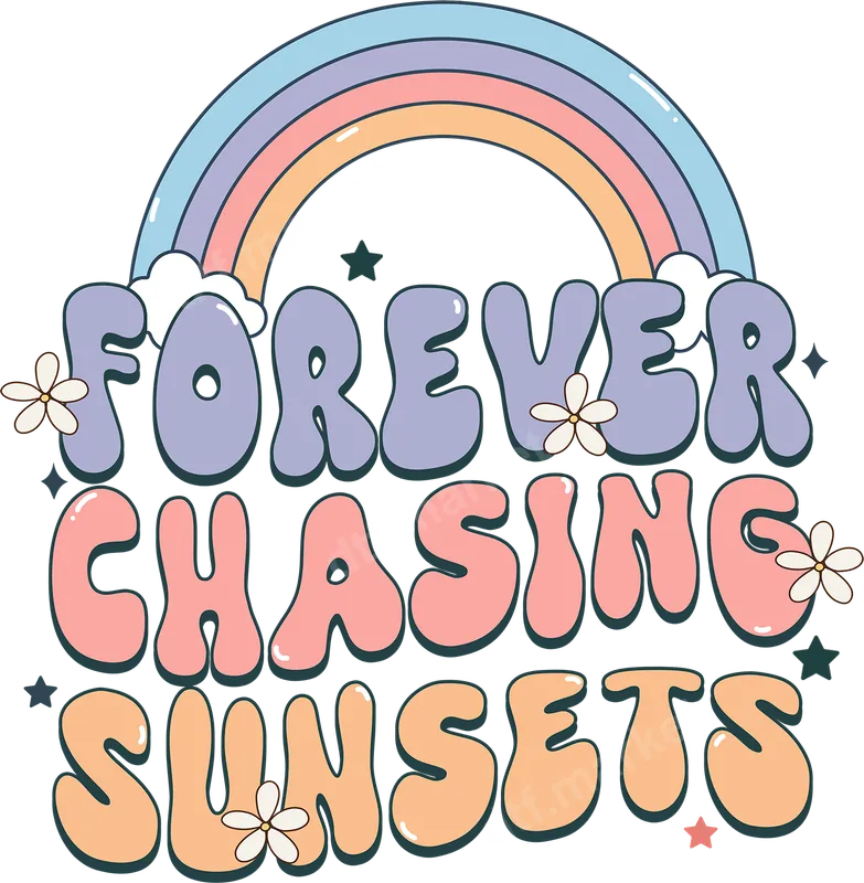 See allThis enchanting Forever Chasing Sunsets DTF transfer captures a whimsical, retro vibe, perfect for those who live life chasing golden hours. Featuring a delightful pastel rainbow arching over bold, bubbly typography, adorned with delicate daisies and twinkling stars, this ready to press design brings a cheerful and carefree spirit to any garment. It’s a high-quality DTF transfer that ensures vibrant colors and crisp details for your apparel projects. Ideal for anyone who loves summer, beach life, and a touch of vintage aesthetic. This inspirational iron on decal makes a fantastic gift for friends and family, perfect for beach vacations, road trips, summer festivals, or simply adding a positive message to everyday wear. Its feel-good sentiment resonates with dreamers and wanderers, making it a versatile design for various occasions. Applying this heat press transfer is incredibly easy. It works beautifully on a wide range of materials including cotton, polyester, and their blends. Simply use a heat press at 300-325°F for 15 seconds with medium pressure, or apply with a household iron. Best of all, there's no weeding required, making your customization process quick and hassle-free. Just press, peel, and wear! Our professional-grade DTF film ensures a durable, crack-resistant, and soft-to-touch finish that stands up to countless washes. Experience truly vibrant colors and a strong adhesive that will keep your favorite heat press design looking fresh for a long time. Transform plain garments into personalized statements with this charming t-shirt transfer.