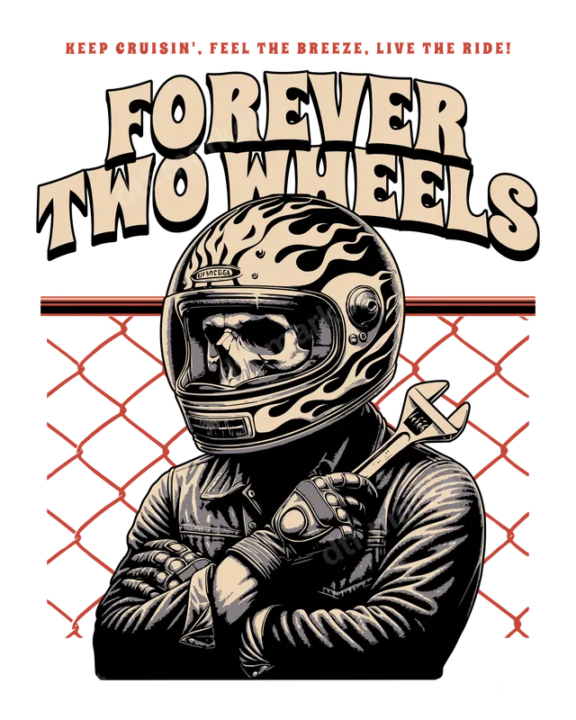 See allThis striking DTF transfer features a skull in a classic flaming motorcycle helmet, sporting a leather jacket and holding a wrench, all against a chain-link fence backdrop. The bold text 'FOREVER TWO WHEELS' is complemented by the rallying cry 'KEEP CRUISIN', FEEL THE BREEZE, LIVE THE RIDE!'. This ready to press design perfectly captures the spirit of the open road, mechanical passion, and the freedom of motorcycle culture. It's an ideal apparel transfer for anyone who lives and breathes the biker lifestyle. This design is a must-have for motorcycle riders, mechanics, vintage bike enthusiasts, and anyone passionate about two-wheeled adventures. It makes a fantastic gift for Father's Day, birthdays, or any occasion for the biker in your life. Perfect for motorcycle rallies, custom garage wear, or just showing off your passion for the ride. Give the gift of unique style with this eye-catching heat transfer design. Applying this direct to film transfer is straightforward and hassle-free. It works beautifully on a wide range of materials including cotton, polyester, and various fabric blends. For best results, use a heat press at 300-325°F for 15 seconds with medium pressure, then peel cold. If you don't have a heat press, a household iron can also be used with care. Enjoy professional-looking results without the tedious weeding required for vinyl transfers. Our premium DTF transfers are crafted for exceptional durability and visual appeal. Expect vibrant colors that pop, superior crack-resistance, and a soft-to-touch finish that feels great on any garment. Each iron on transfer is produced using professional-grade DTF film and high-quality inks, ensuring a strong, lasting adhesive bond and a design that stands the test of time, wash after wash.