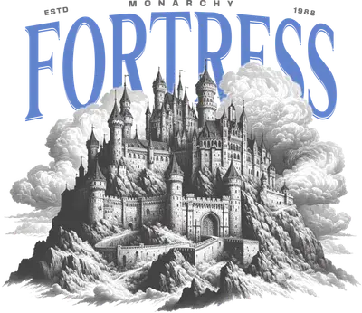 This captivating DTF transfer showcases a magnificent, highly detailed fortress castle perched atop a rugged mountain, enveloped by dramatic clouds. Rendered in a classic monochrome illustration style, it exudes a timeless, majestic grandeur. Overlaid with bold, vibrant blue typography proclaiming "FORTRESS" and subtle "MONARCHY ESTD 1988" details, this design perfectly blends vintage artistry with modern streetwear appeal. Get a professional look with this ready to press design, ideal for creating unique apparel. This striking design is an ideal iron on transfer for anyone who appreciates architectural beauty, fantasy aesthetics, or vintage-inspired graphics. It's perfect for streetwear enthusiasts looking to customize their wardrobe, small apparel businesses seeking unique inventory, or crafters wanting a high-impact heat transfer design for personal projects. Whether for everyday wear, a fashion statement, or a thoughtful gift for a history buff or fantasy fan, this design offers versatile appeal. This versatile heat press transfer works flawlessly on a wide range of fabrics including cotton, polyester, cotton-poly blends, and even nylon. Achieve professional results with a heat press (recommended at 300-325°F for 15 seconds with medium pressure), or a household iron. Enjoy the convenience of no weeding required—simply peel and press! Perfect for custom t-shirts, hoodies, sweatshirts, tote bags, denim jackets, and even pillow covers. For lasting durability, wash garments inside out and tumble dry on low heat. Our ready to press transfer features vibrant, full-color printing with exceptional fine detail, ensuring every turret and cloud is perfectly rendered. This durable transfer is crack-resistant and soft to the touch, providing a comfortable feel without the heavy texture of traditional vinyl. Each direct to film transfer is printed on premium DTF film with a strong adhesive backing, guaranteeing professional-quality results and a long-lasting finish on your chosen garment or accessory.