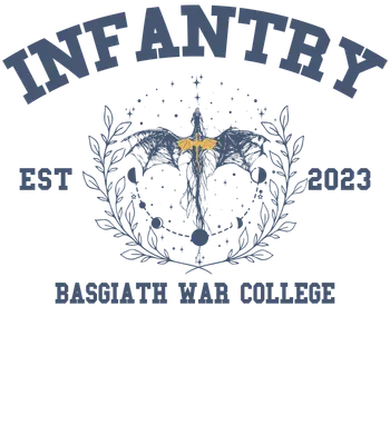See allUnleash your inner dragon rider with this exclusive Fourth Wing Infantry DTF transfer, perfect for fans of Basgiath War College. This striking design features a magnificent, detailed dragon with golden accents, elegantly framed by a celestial wreath adorned with moon phases and stars. Bold collegiate-style text proclaims "INFANTRY" at the top and "BASGIATH WAR COLLEGE" below, with "EST 2023" flanking the central imagery. It’s a ready to press design that captures the essence of the beloved fantasy series with a touch of collegiate pride.