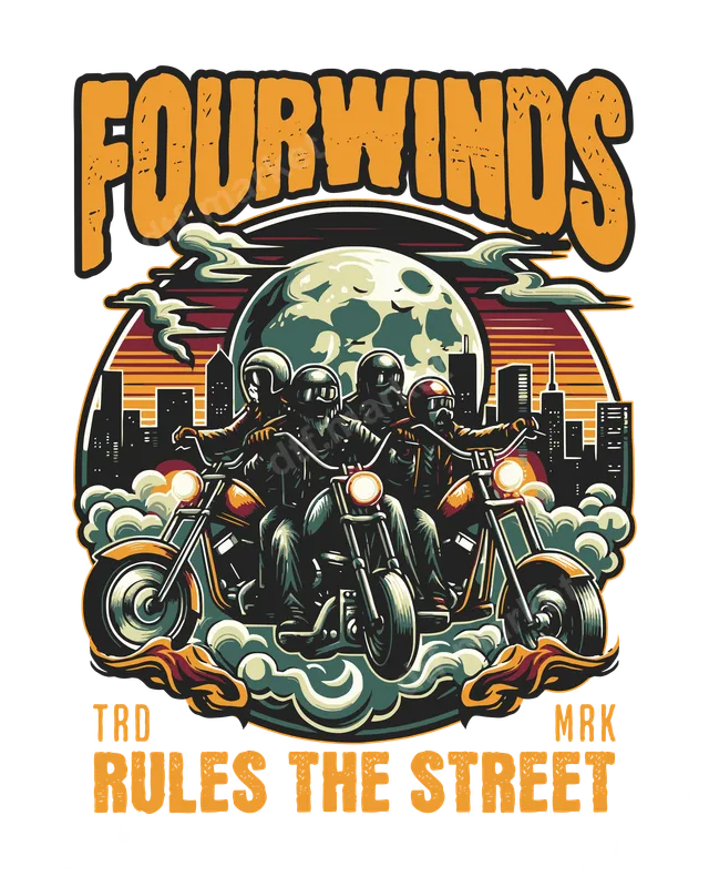 See allThis dynamic DTF transfer features four bikers on motorcycles, set against a vibrant city skyline and large full moon, with a sunset-hued sky. "FOURWINDS" is at the top, and "TRD MRK RULES THE STREET" below, radiating a rebellious, adventurous spirit. This ready to press design's bold colors and retro style capture open-road freedom and urban exploration for thrill-seekers. This Fourwinds biker heat press design is perfect for motorcycle clubs, riders, gearheads, and enthusiasts of chopper culture. An excellent gift for birthdays, Father's Day, or anniversaries, it's also ideal apparel for bike rallies, weekend rides, or casual wear. Express your individuality and passion for the road with this distinctive custom transfer. Our premium direct to film transfers adhere beautifully to various fabrics: 100% cotton, 100% polyester, and blends. Application is simple: use a professional heat press at 300-325°F for 15 seconds with medium pressure. A household iron can also be used. This heat press ready iron on decal requires no weeding or layering, making customization quick and effortless. Experience superior quality with our DTF transfers, known for exceptional durability and vibrant colors. The prints are highly crack-resistant, ensuring your design stays fresh after many washes. The soft-touch finish provides comfort, feeling like part of the fabric. Crafted using professional-grade DTF film with a strong adhesive, these heat press designs are built to last, maintaining crisp details and rich hues.