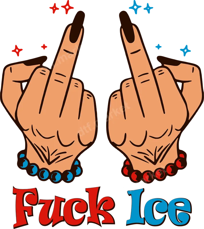 See allThis explicit DTF transfer features two hands defiantly raising their middle fingers, adorned with vibrant red and blue beaded bracelets and sparkling stars. Below the expressive hands, the bold, stylized text "Fuck Ice" is prominently displayed in matching red and blue, conveying a powerful, no-nonsense message. This provocative and edgy design is a statement piece, perfect for those who want their apparel to reflect a strong opinion and a rebellious spirit. It's a high-quality, ready to press transfer that brings attitude to any garment. This adult humor heat transfer is ideal for individuals who are unafraid to express their political or social views with a confrontational edge. It’s perfect for activists, protestors, or anyone looking to make a bold personal statement at rallies, social gatherings, or simply in everyday wear. It also makes a uniquely audacious gift for friends with a similar outspoken attitude or those who appreciate edgy, controversial apparel. This design is not for the faint of heart, but for those ready to stand out. Applying this apparel transfer is incredibly easy and requires no weeding, saving you time and effort. Our premium heat press design is compatible with a wide range of fabrics, including cotton, polyester, and various blends, ensuring versatility for your custom projects. For best results, use a heat press at 300-325°F for 15 seconds with medium pressure. While a heat press is recommended for professional results, you can also achieve a great finish using a household iron with firm, even pressure. Experience superior quality with this durable iron on transfer. Our professional DTF film ensures vibrant, long-lasting colors that resist cracking, peeling, and fading, even after multiple washes. The strong adhesive provides excellent grip on your chosen garment, making it feel soft to the touch and seamlessly integrated into the fabric. Elevate your wardrobe with a custom transfer that offers both outstanding visual impact and impressive durability.