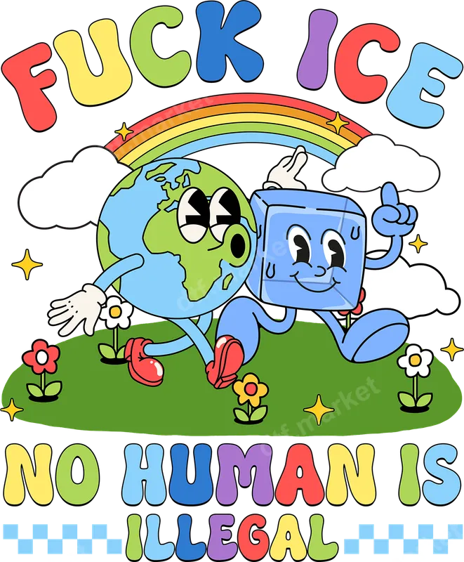 See allThis vibrant DTF transfer features a powerful social justice message in a playful, retro-cartoon style. The design depicts a cheerful Earth planet and a melting, sweating ice cube (symbolizing ICE) running beneath a rainbow, accompanied by the bold statements "FUCK ICE" and "NO HUMAN IS ILLEGAL" in colorful, bubbly typography. This ready to press design is a spirited call for human rights and immigration advocacy. This anti-ICE heat transfer is ideal for activists, immigration advocates, and anyone passionate about social justice and human rights. It's perfect for expressing your views at rallies, protests, community events, or simply as a daily statement of solidarity. Make a powerful political statement on your clothing or gift it to friends and family who share these vital progressive values. Applying this apparel transfer is incredibly easy. Our heat press designs adhere seamlessly to a wide range of fabrics, including cotton, polyester, and cotton/poly blends. For best results, use a heat press at 300-325°F for 15 seconds with medium pressure. It can also be applied with a household iron, making it accessible for everyone. Enjoy professional-quality results with no tedious weeding required. Experience superior quality with our premium direct to film transfer. These iron on transfers boast incredibly vibrant colors, crisp details, and exceptional durability, ensuring your message stands out and lasts. Made from professional-grade DTF film with strong adhesive, the design is crack-resistant, peel-resistant, and feels soft to the touch, providing a comfortable and long-lasting finish on any garment.