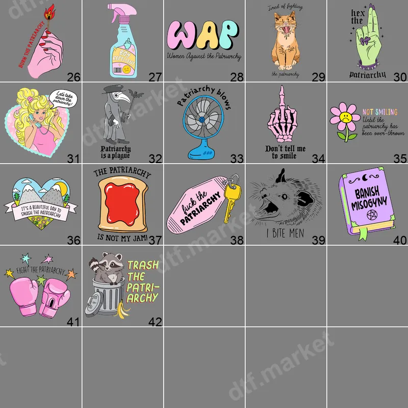 See allUnleash your inner rebel with this "Fuck The Patriarchy" retro keychain DTF transfer. Featuring a vibrant pink motel-style key tag with bold text and a yellow key, this design delivers a clear and unapologetic feminist message. It’s a powerful and stylish ready to press transfer for anyone looking to make a statement. This bold design is perfect for feminists, activists, and allies who want to express their views on gender equality and social justice. Ideal for personalizing apparel for protests, rallies, International Women's Day events, or simply as an everyday expression of your convictions. It also makes an empowering gift for strong women in your life. Applying this direct to film transfer is straightforward. Use a heat press at 300-325°F for 15 seconds with medium pressure, then cold peel for best results. For those without a professional heat press, a household iron can also be used following specific instructions. This durable heat transfer works on a wide variety of fabrics, including cotton, polyester, and blends, and requires no tedious weeding. Our professional-grade DTF transfers ensure vibrant colors that pop and a soft-to-touch feel that won't crack or fade. Crafted with strong adhesive, this apparel transfer promises excellent wash durability and a high-quality finish, making your customized items look professionally done and stand the test of time.