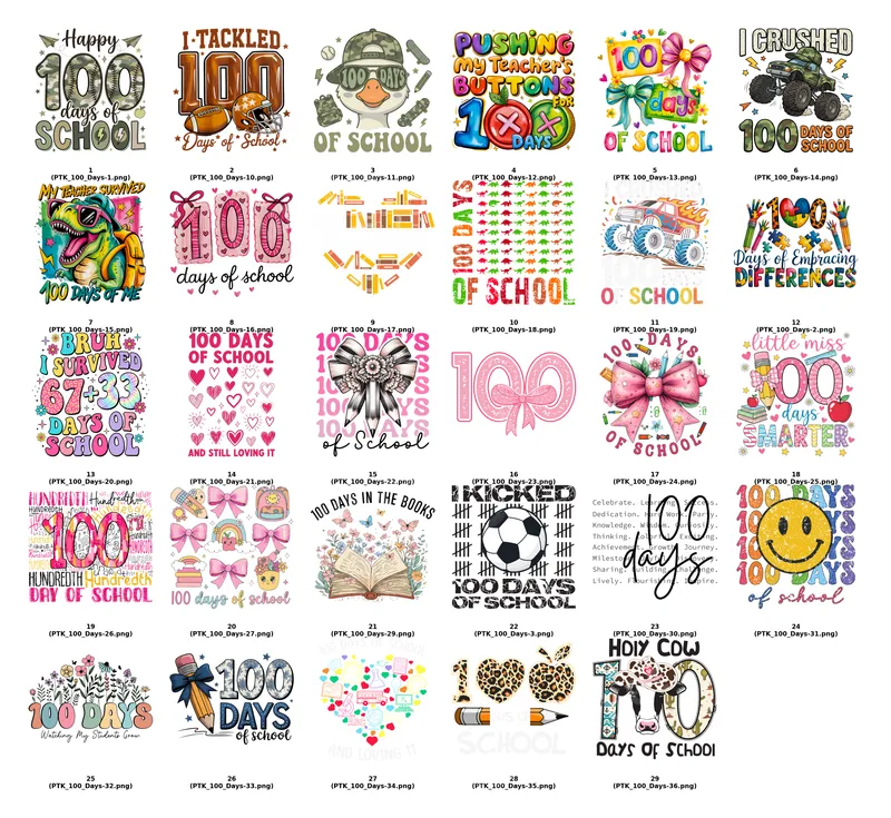See allCelebrate the significant milestone of 100 Days of School with our exciting collection of Direct-to-Film (DTF) transfers! This varied assortment features playful designs ranging from dinosaurs, sports, and cute animals to school supplies and humorous slogans like “Bruh I Survived 67+33 Days of School.” Each high-quality DTF transfer is designed to bring joy and color to your 100th-day celebration, making it a memorable event for everyone involved. These are ready to press, ensuring a quick and easy application process. Our 100 Days of School heat press transfer designs are perfect for elementary school students, dedicated teachers, and proud parents looking to create custom apparel. Ideal for school events, classroom parties, or simply as a fun way to commemorate the achievement, these designs make fantastic gifts for teachers or a special treat for kids. Imagine a classroom full of students wearing their unique 100th Day shirts, each reflecting their personality with our diverse range of iron on decals. Applying these ready to press transfers is straightforward. They work beautifully on a wide variety of fabrics, including 100% cotton, polyester, and cotton/poly blends. For best results, use a heat press at 300-325°F for 15 seconds with medium pressure, then cold peel the film. No weeding required, saving you time and effort. While a heat press is recommended for professional results, these can also be applied with a household iron with careful technique, making them accessible to all. Crafted using professional-grade DTF film and inks, our apparel transfers boast vibrant colors that pop and a soft-to-touch finish that feels great on any garment. These durable designs are crack-resistant and designed to withstand numerous washes, ensuring your 100 Days of School celebration lasts long after the school bells ring. Experience the ease and quality of a premium t-shirt transfer with dtf.market.
