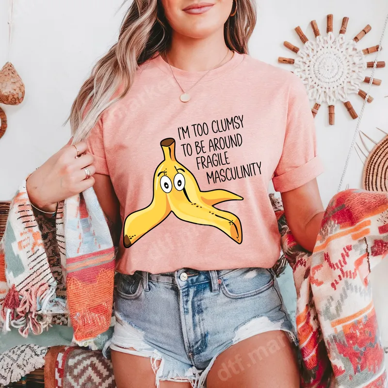 See allThis vibrant DTF transfer features a hilariously wide-eyed banana peel alongside the bold, sarcastic text: "I'M TOO CLUMSY TO BE AROUND FRAGILE MASCULINITY." This ready to press design is perfect for injecting witty, empowering humor into any wardrobe or accessory. It’s a unique statement piece combining playful imagery with a sharp, contemporary message, sure to spark conversation. Designed for individuals with a strong sense of humor, this heat press transfer is ideal for feminists, activists, or anyone appreciating a good laugh at outdated concepts. It makes a fantastic gift for friends, sisters, or colleagues not afraid to speak their minds. Perfect for casual gatherings, parties, or daily wear to express your personality. Applying this high-quality iron on transfer is simple. It works beautifully on cotton, polyester, and blends, offering versatility for many garment types. For best results, use a heat press at 300-325°F for 15 seconds with medium pressure. No weeding required; just press and peel. This apparel transfer can also be applied with a household iron, though a heat press is recommended for optimal results. Our direct to film transfer ensures a vibrant, long-lasting print resistant to cracking and peeling, even after multiple washes. Colors remain brilliant, and the design feels soft to the touch, seamlessly integrating with your chosen garment. Crafted with professional-grade DTF film and strong adhesive, this ready to press transfer provides premium results, transforming plain items into unique apparel.