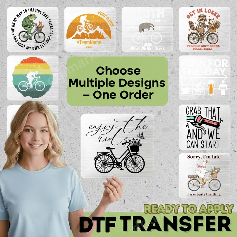 See allExplore our collection of charming and humorous bicycle DTF transfers, perfect for adding personality to any garment. Each design features unique cycling-themed art, from quirky animals on bikes delivering witty one-liners to retro-inspired silhouettes. These vibrant, ready to press designs capture the joy and humor of cycling life, ensuring you’ll find the perfect bike-inspired statement. These versatile heat transfer designs are ideal for cycling enthusiasts, casual riders, meme lovers, and anyone who appreciates a good laugh. They make fantastic gifts for birthdays, Father's Day, or Mother's Day. Perfect for cycling club events, group rides, or expressing a laid-back attitude. Whether you're a mountain biker or enjoy a leisurely pedal, there's a design for you. Some designs even offer customizable elements. Our premium iron on transfers are incredibly easy to apply, compatible with cotton, polyester, and various fabric blends. For best results, use a heat press at 300-325°F for 15 seconds with medium pressure, then peel cold. You can also achieve great results with a household iron, following our detailed instructions. These transfers offer a professional finish with minimal effort, making custom apparel accessible. Crafted using high-quality DTF film and professional-grade inks, our apparel transfers boast exceptional durability and a soft, smooth feel. The vibrant colors are designed to resist cracking, peeling, and fading, ensuring your custom shirts and accessories look great wash after wash. Each transfer provides strong adhesive for a lasting bond, giving your garments a professional, retail-quality appearance.