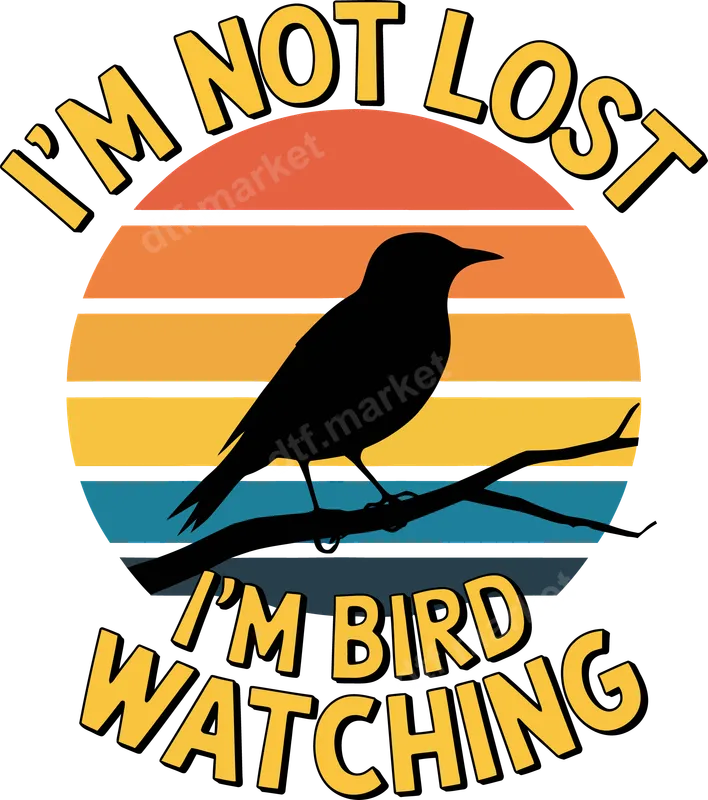 See allThis vibrant DTF transfer features a humorous "I'M NOT LOST I'M BIRD WATCHING" slogan in a cheerful, retro-inspired font. A classic bird silhouette perches calmly on a branch, set against a stunning striped sunset or sunrise backdrop in warm oranges, yellows, and cool blues. This ready to press design perfectly captures the peaceful yet slightly quirky spirit of every dedicated bird watcher. Ideal for birding enthusiasts, nature lovers, and anyone who appreciates a good chuckle outdoors. This heat transfer makes a fantastic gift for birthdays, Father's Day, Mother's Day, or any occasion for friends and family who enjoy spending time in nature. It's also perfect for casual wear, nature walks, or bird-watching events, allowing you to express your passion with a touch of wit. Applying this professional-grade heat press transfer is incredibly simple. Designed to adhere flawlessly to cotton, polyester, and most fabric blends, it ensures versatile use. For best results, use a heat press at 300-325°F for 15 seconds with medium pressure. It can also be applied with a household iron (follow instructions carefully). No weeding, no layering – just a quick and easy iron on transfer for instant customization. Our premium direct to film transfer technology delivers incredibly vibrant colors, crisp details, and exceptional durability. This high-quality apparel transfer is crack-resistant, peel-resistant, and boasts a soft, flexible feel that seamlessly integrates with your garment. Enjoy a professional-looking finish that will withstand countless washes and maintain its brilliance, making your custom creations last.