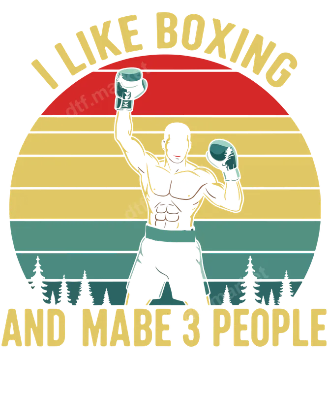 See allThis hilarious DTF transfer captures the spirit of boxing combined with a classic introverted joke. Featuring a triumphant boxer in teal gloves against a vibrant retro sunset with a subtle forest silhouette, the design proudly states, "I LIKE BOXING AND MABE 3 PEOPLE." This ready to press design is perfect for adding a touch of humor and personality to any garment. Ideal for boxing enthusiasts, gym-goers, or anyone with a dry, sarcastic sense of humor, this heat press transfer makes a fantastic gift. It's great for birthdays, Father's Day, or simply to express a relatable sentiment. Surprise a friend who loves the ring more than crowded rooms, or treat yourself to a unique iron on decal that truly speaks your mind. Applying this direct to film transfer is straightforward with a heat press at 300-325°F for 15 seconds with medium pressure, or even a household iron. It adheres beautifully to a wide range of fabrics, including cotton, polyester, and their blends, making it versatile for almost any apparel. Enjoy the convenience of a ready to press transfer with no tedious weeding required. Our DTF transfers are crafted with professional-grade film and strong adhesive, ensuring vibrant colors that pop and a soft, crack-resistant finish. This high-quality apparel transfer maintains its integrity wash after wash, providing a durable and professional-looking heat press design every time. Elevate your wardrobe with a premium custom transfer that lasts.