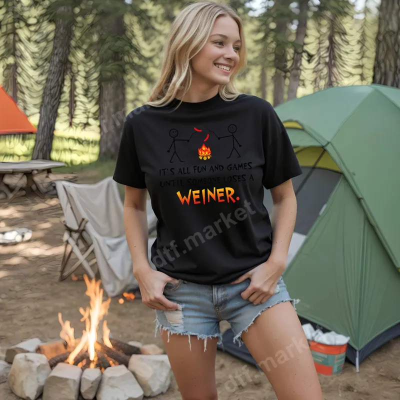 See allThis hilarious DTF transfer features two stick figures roasting hot dogs over a campfire, accompanied by the witty text: "IT'S ALL FUN AND GAMES UNTIL SOMEONE LOSES A WEINER." With its playful design and subtly suggestive pun, this ready to press transfer is guaranteed to spark smiles and knowing glances. The vibrant colors and emphasized "WEINER" text make this heat press design a bold statement for any apparel. Perfect for anyone who appreciates a good laugh and cheeky humor, this design is ideal for camping trips, backyard BBQs, bonfires, or as a conversation starter. It makes an excellent gift for friends, family, or partners who enjoy adult humor and spending time outdoors. Create custom t-shirts for a group camping trip or a unique present for Father's Day, anniversaries, or just because. Applying your new design is incredibly easy. This high-quality iron on transfer works flawlessly on cotton, polyester, and various blends. For best results, use a heat press at 300-325°F for 15 seconds with medium pressure. While a heat press is recommended, you can also achieve great results with a household iron. There's no tedious weeding required – simply press and peel! Experience superior quality with our premium DTF transfers. Each design is printed with vibrant, long-lasting inks that resist cracking, peeling, and fading, ensuring your customized apparel looks fantastic wash after wash. The professional-grade DTF film provides a soft, flexible feel that seamlessly integrates with the fabric, avoiding the stiff texture of traditional vinyl transfers. Your durable, eye-catching apparel transfer will truly stand out.