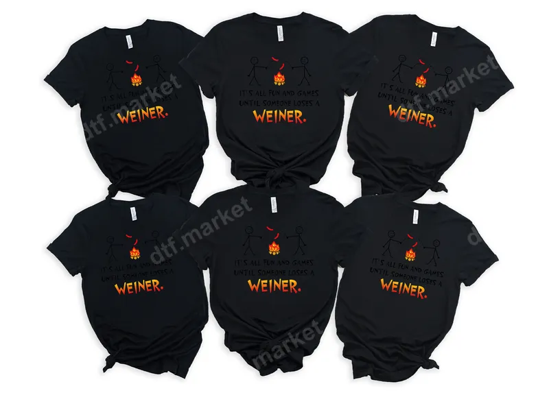See allGet ready for some laughs around the campfire with our hilarious "It's All Fun and Games Until Someone Loses a Weiner" DTF transfer. This design features two playful stick figures roasting hot dogs over a crackling campfire, perfectly capturing the spirit of outdoor fun with a witty, slightly cheeky twist. It's a ready to press design that’s sure to be a conversation starter and bring smiles to anyone who gets the joke. This unique direct to film transfer is perfect for injecting some adult humor into your apparel. This amusing design is ideal for campers, BBQ enthusiasts, and anyone with a robust sense of humor. It makes a fantastic novelty gift for friends, family, or even yourself, perfect for camping trips, backyard barbecues, summer gatherings, or even as a humorous addition to bachelor party attire. Stand out at your next outdoor adventure or casual get-together with this eye-catching and funny statement piece. Applying this heat transfer is simple and efficient. Our high-quality iron on transfer works seamlessly on a wide range of materials, including cotton, polyester, and various blends. For best results, use a heat press at 300-325°F for 15 seconds with medium pressure, then peel cold. If you're using a household iron, ensure even, firm pressure. Best of all, there's no weeding required, making your customization process quick and hassle-free. Experience professional-grade results with our premium DTF film. This apparel transfer boasts vibrant, crisp colors and exceptional detail that will make your design pop. It's designed to be crack-resistant, fade-resistant, and incredibly soft to the touch, ensuring comfort and longevity for your finished garments. The strong adhesive ensures your design stays put, wash after wash, maintaining its quality and humor for years to come.