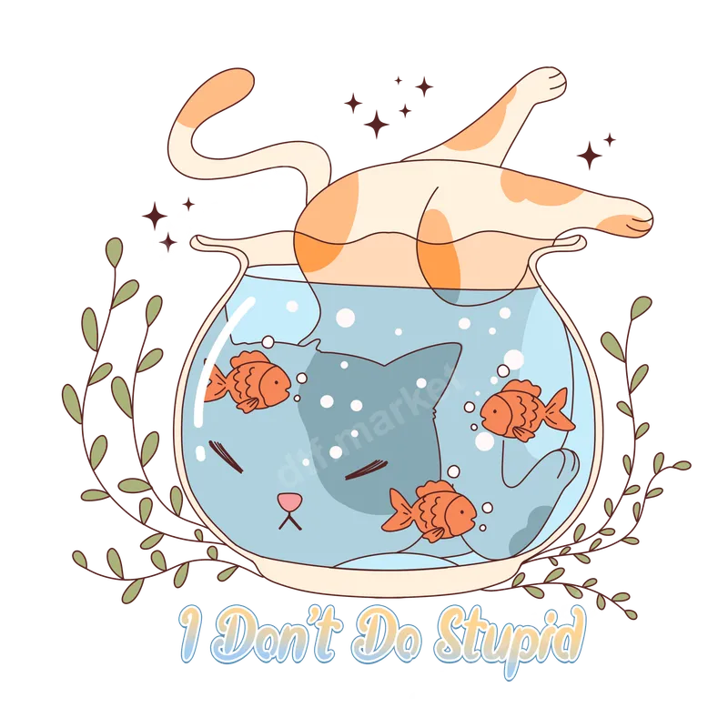 See allDive into humor with our 'I Don't Do Stupid' DTF transfer. This charming design features a serene blue-grey cat's head submerged in a goldfish bowl, surrounded by three goldfish and delicate greenery. An orange and white cat rests casually above the water, embodying pure relaxation. Playful gradient text below reads, 'I Don't Do Stupid,' adding witty sass. It's a ready to press design combining cute, clever, and humorous vibes, perfect for personalizing any garment. This unique heat transfer is ideal for cat lovers, pet owners, and anyone with a sarcastic sense of humor. It makes a fantastic gift for friends or family who appreciate witty sayings, or for yourself to express a laid-back, intelligent attitude. Perfect for casual wear or adding personality to your everyday wardrobe, this design resonates with those who enjoy cute aesthetics and clever statements. Applying this heat press ready transfer is incredibly simple. Designed for seamless use with a heat press, it adheres beautifully to cotton, polyester, and blends. For best results, apply at 300-325°F for 15 seconds with medium pressure. It's also suitable for a household iron. This iron on decal comes completely pre-printed and ready for immediate pressing, saving you time and effort over traditional vinyl transfers. Our premium DTF transfer boasts vibrant colors, exceptional durability, and a soft, flexible feel. The advanced direct to film transfer technology ensures a crack-resistant finish that stands up to countless washes, maintaining its vividness. Each apparel transfer is printed on professional-grade DTF film with strong adhesive, guaranteeing a long-lasting, high-quality result for your customization projects.