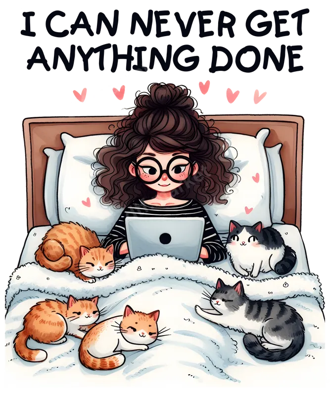 See allThis charming DTF transfer features a relatable scene: a person with curly hair and glasses, working on a laptop in bed, surrounded by five adorable cats. The text "I CAN NEVER GET ANYTHING DONE" perfectly captures the humorous reality of living with feline companions. This ready to press design brings a touch of lightheartedness and warmth, celebrating the delightful distractions of a devoted cat parent. This unique design is a must-have for anyone who adores their cats too much to be productive. It’s perfect for cat moms, cat dads, pet owners, and even students or remote workers who understand the struggle of competing with purring distractions. Ideal for casual wear, relaxed weekends, or as a thoughtful gift for birthdays, Mother's Day, or simply to bring a smile to a fellow cat enthusiast. Applying this iron on transfer is a breeze! Our high-quality heat press transfers are suitable for cotton, polyester, and various blends. For best results, use a heat press at 300-325°F for 15 seconds with medium pressure, then cold peel. For those without a professional press, a household iron can also be used. Enjoy creating custom apparel without weeding, making it a truly ready to press transfer. Experience professional quality with every application. Our DTF transfers are known for their vibrant colors, exceptional durability, and crack-resistant finish. The soft-touch feel ensures maximum comfort on any garment. Printed on premium DTF film with strong, reliable adhesive, these shirt designs provide a long-lasting, high-definition result that stands up to washes and wear. Create apparel that looks fantastic and feels great.