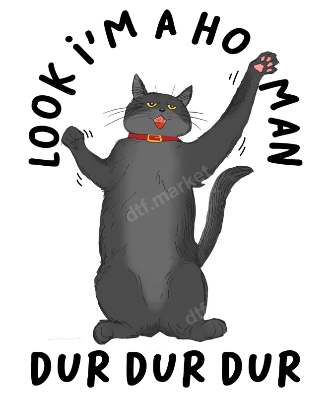 See allThis hilarious DTF transfer features a confident, slightly mischievous grey cat with its arms raised, proclaiming "LOOK I'M A HO MAN" in an arched text above, complemented by the amusing "DUR DUR DUR" below. This design perfectly captures a sense of internet-style humor and playful absurdity, making it an instant conversation starter. It's a truly unique, ready to press design that embodies the quirky side of feline fanatics and meme culture. Ideal for cat lovers, Gen Z humor enthusiasts, meme connoisseurs, or anyone who appreciates a good chuckle, this design is perfect for casual wear, social gatherings, or simply making a statement. It makes a fantastic gift for friends, family, or even yourself, for birthdays, holidays, or just because you want to spread some lighthearted fun. Add this funny heat press design to your collection and watch the smiles appear. Our direct to film transfers are incredibly versatile and easy to apply to a wide range of garments. Whether you're customizing a cotton t-shirt, a polyester blend hoodie, or a canvas tote bag, this iron on transfer adheres beautifully. For best results, use a heat press at 300-325°F for 15 seconds with medium pressure, then cold peel. No complex weeding or layering required, making DIY apparel simple and enjoyable. Experience superior quality with our professional-grade DTF transfers. Each transfer boasts vibrant colors, excellent wash durability, and a soft, smooth feel that won't crack or peel. Crafted using premium DTF film and strong adhesive, this apparel transfer ensures a long-lasting, professional finish on all your projects. Elevate your wardrobe with a durable and eye-catching shirt design that truly stands out.