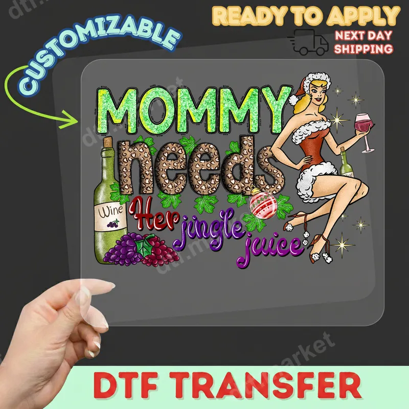See allThis vibrant DTF transfer features the humorous phrase "Mommy Needs Her Jingle Juice" in a festive, mixed-media style. The design showcases a retro pin-up style Santa woman enjoying a glass of wine, surrounded by festive grapes, holly, and a Christmas ornament. The lettering boasts glittery effects on "Mommy" and "jingle juice," with "needs" in a trendy leopard print, creating a fun and sassy vibe. This ready to press design is perfect for adding a touch of holiday cheer and adult humor to any garment or accessory. This unique design is tailored for mothers who appreciate a good laugh and a festive drink during the busy holiday season. It's an excellent choice for Christmas parties, family gatherings, or just for enjoying some relaxed moments. It makes a fantastic gift idea for a mom, grandma, or any friend who juggles holiday responsibilities with a sense of humor. Imagine creating custom t-shirts for a "Mom's Night Out" or a humorous gift for a secret Santa exchange. Applying this design is a breeze, making it a favorite for DIY enthusiasts and small business owners alike. Our high-quality heat transfer works beautifully on a wide range of fabrics, including 100% cotton, polyester, and various blends. For best results, use a heat press at 300-325°F for 15 seconds with medium pressure, then perform a cool peel. No more tedious weeding or layering like traditional vinyl transfers; simply press and enjoy. It can even be applied with a household iron with careful technique. Experience the superior quality of our professional DTF film. These direct to film transfers boast incredibly vibrant colors that pop and a soft-to-touch finish that feels great on any apparel. Engineered for durability, our heat press designs are crack-resistant and maintain their integrity wash after wash. The strong adhesive ensures your iron on decal will stay put, offering a long-lasting, professional-grade finish. Elevate your creations with these top-tier, ready-to-press transfers.
