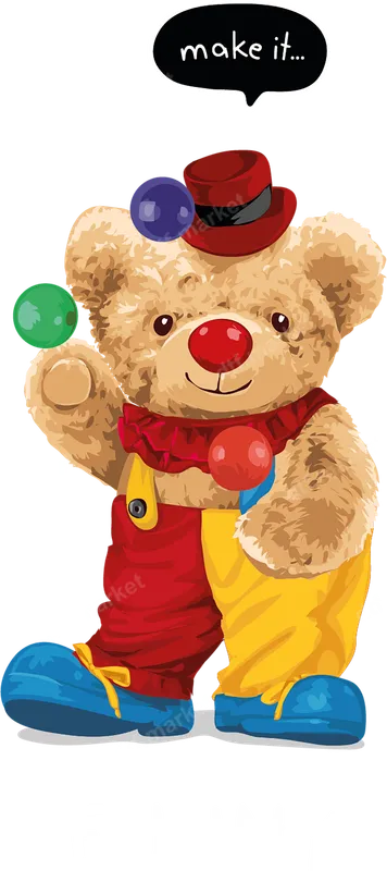 See allStep right up and add a touch of whimsy with this delightful Juggling Clown Teddy Bear DTF transfer! This charming design features a cute teddy bear dressed as a cheerful clown, complete with a red top hat, oversized shoes, and a playful red nose, expertly juggling three colorful balls. A speech bubble above its head playfully reads 'make it...', inviting creativity and fun. This high-quality DTF transfer is ready to press, making it simple to bring this adorable character to life on any fabric. Perfect for kids, circus enthusiasts, or anyone who loves a good laugh, this funny heat transfer design is ideal for birthday party favors, carnival-themed events, or simply brightening up everyday wear. It makes an excellent gift for teddy bear collectors, aspiring clowns, or creative individuals looking to personalize apparel. Imagine this cute iron on decal on matching family shirts for a fun outing or as a unique present that sparks joy. Our premium heat press transfer works beautifully on a wide range of materials, including cotton, polyester, and various blends. Applying your shirt design is quick and effortless: simply use a heat press at 300-325°F for 15 seconds with medium pressure, or apply with a household iron. The best part? There’s no weeding involved, saving you time and hassle. You get a crisp, professional result every time with this ready to press transfer. Experience superior quality with our Direct to Film transfer prints. Designed for durability and vibrancy, this apparel transfer boasts rich colors that stand out, is crack-resistant, and remains soft to the touch even after multiple washes. Crafted using professional-grade DTF film and a strong adhesive, your custom transfer will last, providing a long-lasting, comfortable decoration for all your garments and accessories.