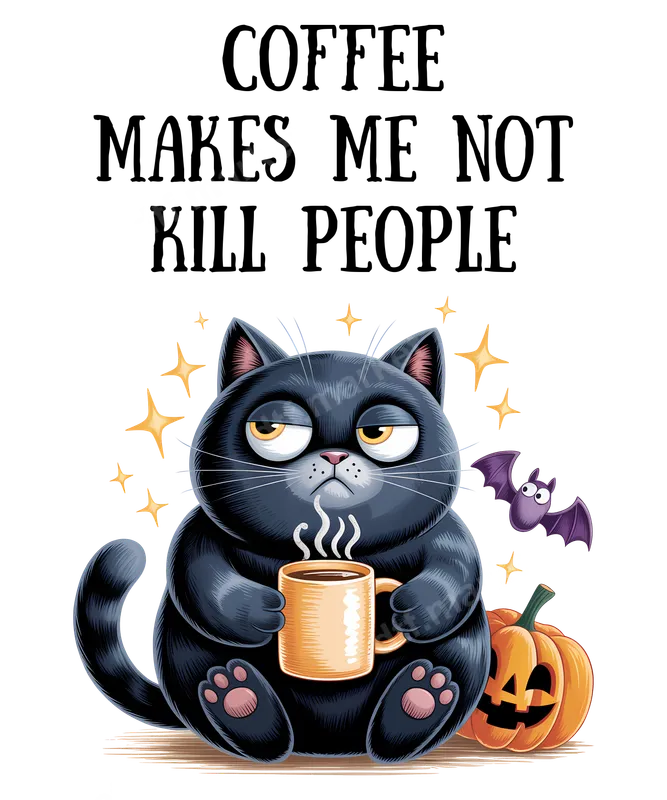 Funny Coffee Cat DTF Transfer | Sarcastic Halloween Black Cat Design