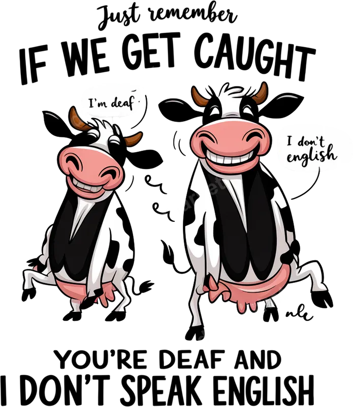 See allUnleash some mischievous humor with this 'Just Remember If We Get Caught, You're Deaf and I Don't Speak English' DTF transfer. This hilarious design features two grinning cartoon cows, one exclaiming 'I'm deaf' and the other 'I don't english,' perfectly illustrating a classic 'partners in crime' scenario. It's a fantastic ready to press transfer that brings a lighthearted, cheeky vibe to any garment, guaranteed to get smiles and knowing nods. This vibrant heat transfer is ideal for anyone who appreciates witty banter and shared secrets. This funny cow heat press design is perfect for best friends, siblings, or even spouses who share an unbreakable bond and a penchant for getting into (and out of) trouble together. It makes an excellent gift for birthdays, holidays, or just because you want to share a laugh. Whether you're planning a group outing, a family reunion, or simply want to add a dose of farm animal humor to your everyday wear, this iron on transfer is designed for those who don't take life too seriously and enjoy a good inside joke. Applying this ready to press transfer is incredibly simple, making it accessible for everyone. It adheres beautifully to a wide variety of fabrics, including 100% cotton, polyester, and popular cotton-poly blends. For best results, use a heat press set to 300-325°F for 15 seconds with medium pressure. Even if you don't have a professional heat press, you can achieve great results with a household iron. Forget the hassle of weeding vinyl transfers; our DTF transfers are precision-cut and require no extra steps before pressing. Our premium DTF transfers are crafted using professional-grade film and inks, ensuring exceptional vibrancy and durability. The colors will pop on any garment, maintaining their brilliance wash after wash. You'll love the soft-to-touch feel of the finished design, which remains flexible and crack-resistant over time. With strong adhesive properties, this t-shirt transfer creates a long-lasting, high-quality finish on your apparel, making your customized items look professionally made and ready for everyday adventures.