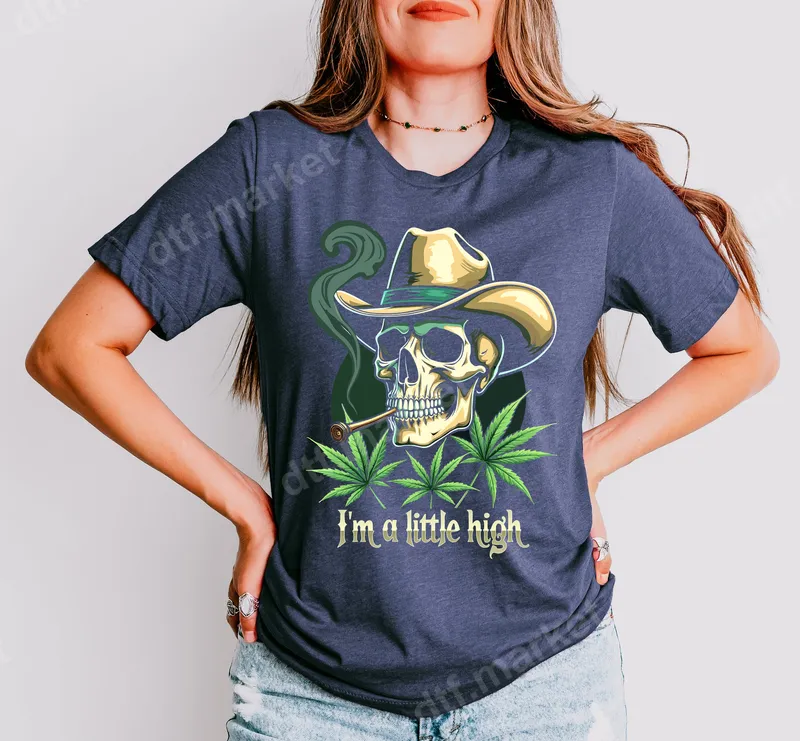 See allThis unique DTF transfer features a cool, laid-back skull sporting a classic cowboy hat and puffing on a pipe, surrounded by vibrant green cannabis leaves. The cheeky phrase "I'm a little high" perfectly captures the relaxed and humorous vibe of this ready to press design. It’s a bold and fun statement piece for anyone who enjoys a bit of edgy humor with a western twist. Designed for cannabis enthusiasts, cowboys, or anyone with a rebellious sense of humor, this heat transfer is perfect for casual outings, festivals, or just lounging around. It makes an excellent gift for friends who appreciate unique apparel or for celebrating 4/20. Apply this vibrant iron on transfer to your favorite garments to show off your personality and make a statement. Our premium heat press transfer works beautifully on a wide range of fabrics, including cotton, polyester, and various blends. For best results, use a heat press at 300-325°F for 15 seconds with medium pressure, then peel cold. You can also achieve great results with a household iron (firm, even pressure for 20-30 seconds). No more tedious weeding or layering, just press and go with this heat press ready design! Experience superior quality with this apparel transfer. Each design is printed with vibrant, long-lasting inks that resist cracking and fading, ensuring your garment looks great wash after wash. The professional-grade DTF film provides a soft, flexible feel that seamlessly integrates into your fabric, offering comfort and durability. This ready to press transfer is built to last.