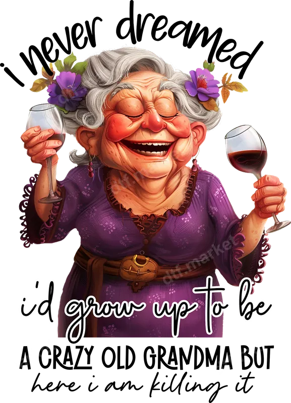 See allThis hilarious DTF transfer features a joyfully expressive older woman, complete with gray hair and vibrant purple flowers, raising two glasses of red wine. The accompanying text, "I never dreamed I'd grow up to be A CRAZY OLD GRANDMA BUT here i am killing it," perfectly captures a sassy and confident spirit. This ready to press design is full of character and brings a touch of humor to any garment. This funny heat press design is an ideal choice for grandmas who love wine, have a great sense of humor, and embrace their "crazy" side. It makes a fantastic gift for Mother's Day, birthdays, Grandparents' Day, or just because. Perfect for family gatherings, casual outings, or just lounging at home, celebrating the unique charm of grandmas everywhere. Our high-quality DTF transfer works flawlessly on a wide range of materials, including cotton, polyester, and their blends. Applying this iron on transfer is simple with a heat press at 300-325°F for 15 seconds with medium pressure. It can also be applied using a household iron for smaller batches, making it accessible for everyone. Best of all, there's no weeding required, saving you time and effort. Experience vibrant colors and crisp details with every application of this apparel transfer. Our direct to film transfers are designed for durability, resisting cracks and peels even after multiple washes. The professional-grade DTF film ensures a soft feel on the garment and a strong, long-lasting adhesive bond. Get professional results with this heat press ready design every time.