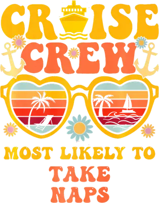 See allSet sail for relaxation with this vibrant and funny 'CRUISE CREW MOST LIKELY TO TAKE NAPS' DTF transfer. Featuring a charming retro aesthetic, the design showcases bold, bubbly typography, a classic cruise ship, playful anchors, and heart-shaped sunglasses reflecting a serene beach scene with palm trees and a sailboat. It’s a perfectly charming and humorous direct to film transfer for anyone ready to embrace vacation mode and catch some Zs. This nostalgic heat transfer design is ideal for cruise enthusiasts, family vacation groups, or friends planning a relaxing getaway. Imagine coordinating group shirts for your next cruise trip, creating unique gifts for fellow travelers, or simply adding a touch of laid-back humor to your everyday wardrobe. This iron on transfer is perfect for small boutique owners, crafters, or anyone looking to create custom apparel with a fun, vintage vibe. Applying this heat press transfer is incredibly easy, making it accessible for both experienced crafters and beginners. It works beautifully on a wide range of materials, including cotton, polyester, cotton-poly blends, and even nylon. Simply use a heat press set to 300-325°F for 15 seconds with medium pressure, or apply it with a household iron. There's no tedious weeding required—just peel and press! It's perfect for custom t-shirts, cozy hoodies, beach-ready tote bags, or fun aprons. For best results and lasting durability, wash garments inside out and tumble dry on low. Experience professional-grade results with this premium ready to press transfer. It boasts vibrant, full-color printing with exceptional detail, ensuring your design truly pops. The transfer is crack-resistant and provides a soft, lightweight feel without the heavy, stiff texture often associated with vinyl. Each direct to film transfer is printed on high-quality DTF film with a robust adhesive backing, guaranteeing a smooth and professional application every time.